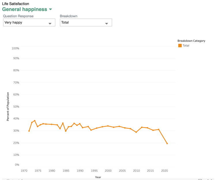 More people say they’re not too happy than say they’re very happy for the first time since the survey began.