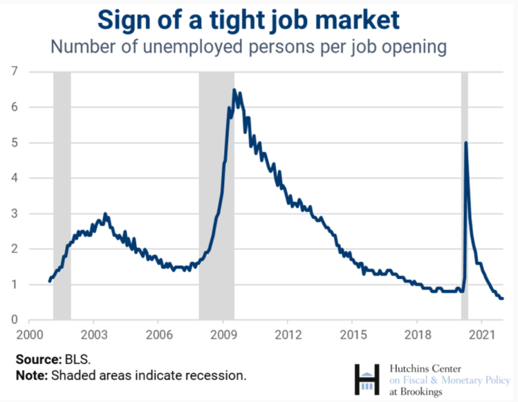 JOLTS also counts the number of positions for which employers are actively recruiting and would start within 30 days of hire. The number of unfilled jobs is a measure of the unmet demand for labor. The ratio of the number of unemployed per job opening is a way to gauge the strength of the job market; the lower this ratio, the closer the economy is to maximum employment.