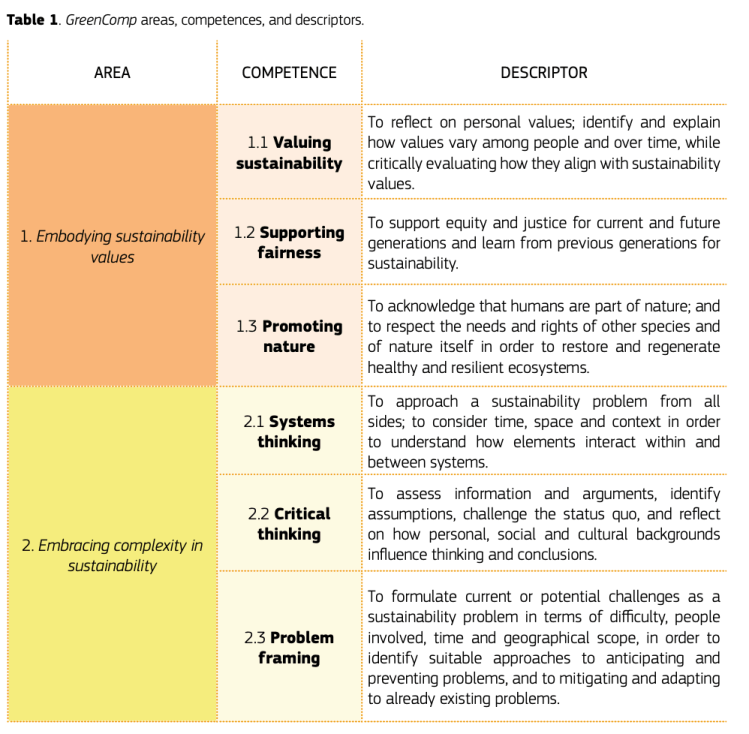 GreenComp is a reference framework for sustainability competences. It provides a common ground to learners and guidance to educators, providing a consensual definition of what sustainability as a competence entails. It is designed to support education and training programmes for lifelong learning. It is written for all learners, irrespective of their age and their education level and in any learning setting – formal, non-formal and informali. Sustain- ability competences can help learners become systemic and critical thinkers, as well as develop agency, and form a knowledge basis for everyone who cares about our planet’s present and future state.