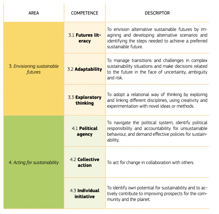 The results presented in this report form a framework for learning for environmental sustainability that can be applied in any learning context. The report shares working definitions of sustainability and learning for environmental sustainability that forms the basis for the framework to build consensus and bridge the gap between experts and other stakeholders. GreenComp comprises four interrelated competence areas: (1) embodying sustainability values; (2) embracing complexity in sustainability; (3) envisioning sustainable futures; and (4) acting for sustainability. Each area comprises three competences that are interlinked and equally important. GreenComp is designed to be a non-prescriptive reference for learning schemes fostering sustainability as a competence.