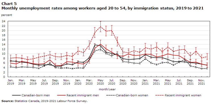 The labour market outcomes of recently arrived immigrants are often more negatively affected during recessions than those of the Canadian born. Entering the labour market during a recession may also result in “scarring” effects for both immigrants and Canadian-born workers. But the severity and characteristics of recessions vary significantly and may affect the outcomes of immigrants differently. This paper compares immigrants’ outcomes during the past three recessions. The early-1990s recession was more severe and lasted longer than the 2008/2009 recession. The 1990s recession had a large differential impact on the employment rates and earnings of recent immigrants, relative to the Canadian born, while the milder 2008/2009 recession had relatively little differential effect. Both recessions hit the goods-producing sector hardest, and disproportionately affected men, younger workers, and workers with lower levels of education and low seniority. During the COVID-19 downturn, accommodation and food services and retail trade were hit particularly hard; low-wage workers bore the brunt of the recessionary effect, along with less educated workers and young women. Recently immigrated women experienced a greater increase in unemployment than Canadian-born women during the COVID-19 recession, caused in part by their over-representation in some of these groups. There was a small difference between recently immigrated and Canadian-born men in employment and unemployment rates during the COVID-19 recession. There was evidence consistent with possible “scarring” effects for the longer-term earnings of immigrants entering during the early 1990s recession. Evidence from the 2008/2009 recession did not support such a conclusion. It is too early to assess the longer-term effects of the COVID-19 downturn.