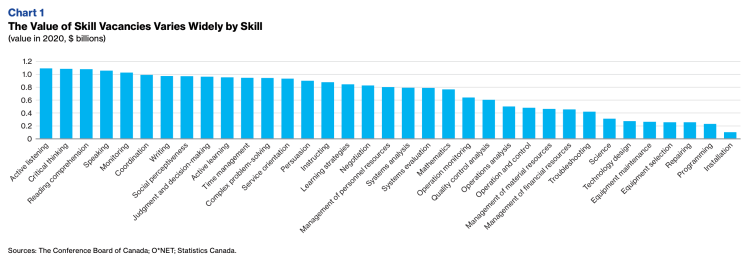 • The six most highly valued skill vacancies are active listening, critical thinking, reading comprehension, speaking, monitoring, and coordination. Vacancies related to each of these skills currently cost the Canadian economy $1 billion or more annually in unrealized value owing to unfilled job vacancies.