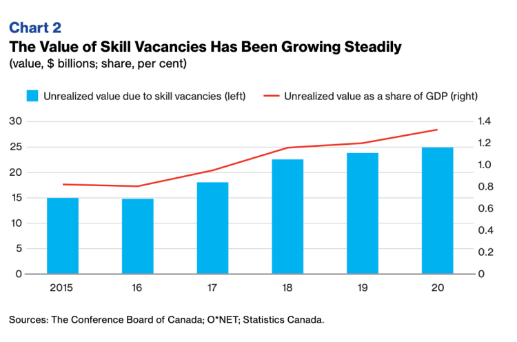 • The unrealized value of skill vacancies in the Canadian economy rose from $15 billion in 2015 to $25 billion in 2020. Rising job vacancy numbers and wage rates, as well as changes in the mix of jobs with vacancies, all contributed to this increase.