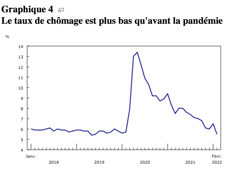 Le taux de chômage a diminué de 1,0 point de pourcentage pour s’établir à 5,5 % en février 2022, ce qui est inférieur au niveau de février 2020 (5,7 %) et juste au-dessus du creux record de 5,4 % observé en mai 2019.