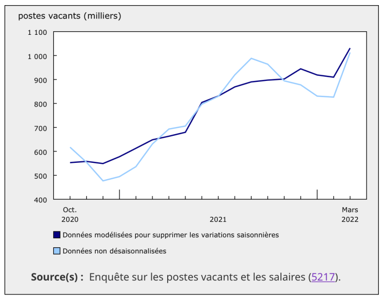 Le taux de postes vacants, qui permet de mesurer le nombre de postes vacants en proportion de tous les postes (vacants et occupés), s’est établi à 5,9 % en mars 2022, ce qui correspond au niveau record observé en septembre 2021 (données non désaisonnalisées).