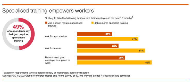 What makes a worker feel empowered? Specialised training is one element. Among respondents, almost half said their job requires some level of specialist training. This group was far more likely than other respondents to say they would ask for a raise or promotion in the next 12 months. The good news is that empowered workers are also more likely to recommend their company to others.
