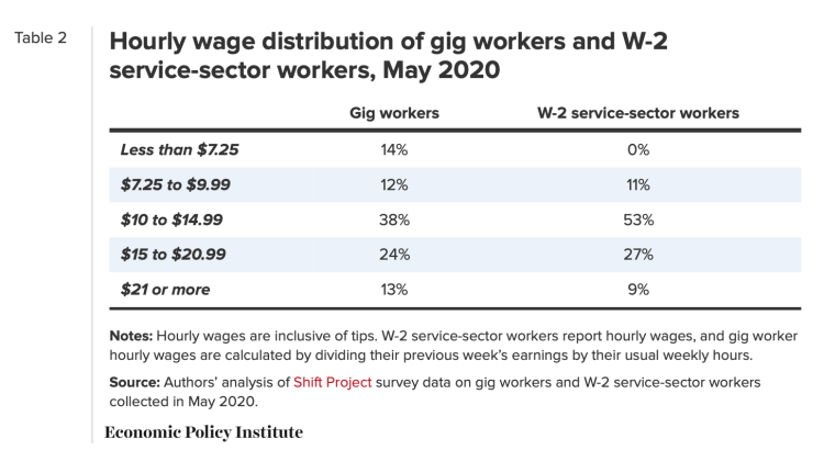 - About 1 in 7 gig workers (14%) earned less than the federal minimum wage on an hourly basis. More than a quarter (29%) earned less than the state minimum wage that would be applicable if they were a W-2 service-sector worker.