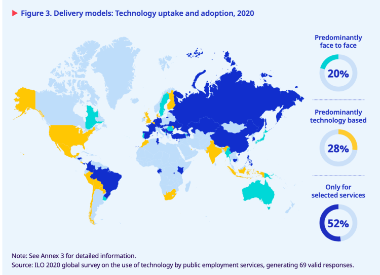 Public employment services worldwide responded to the COVID-19 crisis by deploying immediate support to workers, jobseekers and enterprises affected in terms of business shutdowns and job losses. But they also mobilized resources to sustain infrastructure and deliver services remotely and to develop innovative technology-based solutions for employment searching and hiring. The combined effects of the global pandemic and the general trend of digitalization are pushing public employment services to accelerate their use of innovation to develop and deliver simpler, faster and better services for clients. Even prior to the pandemic, technology had become increasingly important for public employment services to modernize. Public employment services officers were looking at technology as a helpful means for expanding service coverage and for introducing automation and faster processes. To explore the state of practice in the public employment services’ use of technology to facilitate service delivery, the International Labour Organization (ILO) designed a global survey prior to the COVID-19 crisis. It was conducted with the support of the World Association of Public Employment Services between May and October 2020, when the COVID-19 pandemic was in full swing. In total, 69 public employment services officers in 64 countries from all ILO regions responded to the self-administered questionnaire, voicing the position of their respective national employment service system.