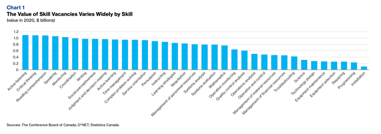 - The six most highly valued skill vacancies are active listening, critical thinking, reading comprehension, speaking, monitoring, and coordination. Vacancies related to each of these skills currently cost the Canadian economy $1 billion or more annually in unrealized value owing to unfilled job vacancies.