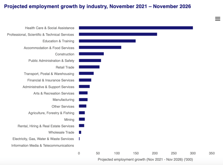 The National Skills Commission (NSC) Employment Projections provide a guide to the likely direction of the jobs market over the next five years. Each year these projections are updated to reflect emerging trends and developments. The latest data available are for the five years to November 2026.