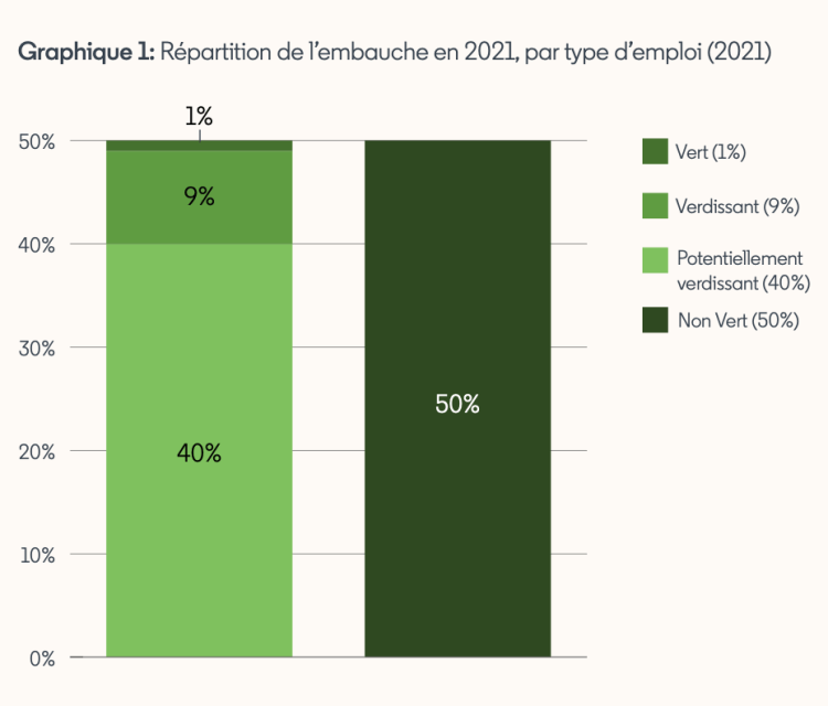 L’année dernière, près de 10 % des offres d’emploi répertoriant une liste des compétences requises incluaient au moins une compétence verte. Ce chiffre concordait, de manière générale, avec le taux de recrutement enregistré pour les emplois verts ou les emplois verdissants, qui s’élevait à 10 % au cours de la même année (graphique 1). Toutefois, si le nombre d’offres d’emploi exigeant des compétences vertes connaît une croissance annuelle de 8 % depuis cinq ans, la part de talents verts n’a, elle, augmenté que de 6 % chaque année sur cette même période.