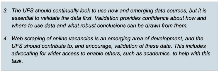 • Analysing current and past data is important in understanding demand for skills (or bundles of skills). Many of these are transferable skills, which will be generally useful in the face of an uncertain future.