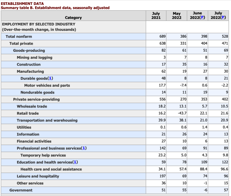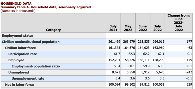 Chosen excerpts by Job Market Monitor. Read the whole story @ Employment Situation Summary – 2022 M07 Results