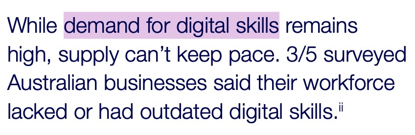 A reliance on hiring externally – for example through sources of talent like migration, job seekers, and the graduate pool – to fill skills gaps has flow-on consequences for the sustainability of Australia’s labour-market. It can put pressure on an already tight supply of labour, particularly for workers with digital skills.