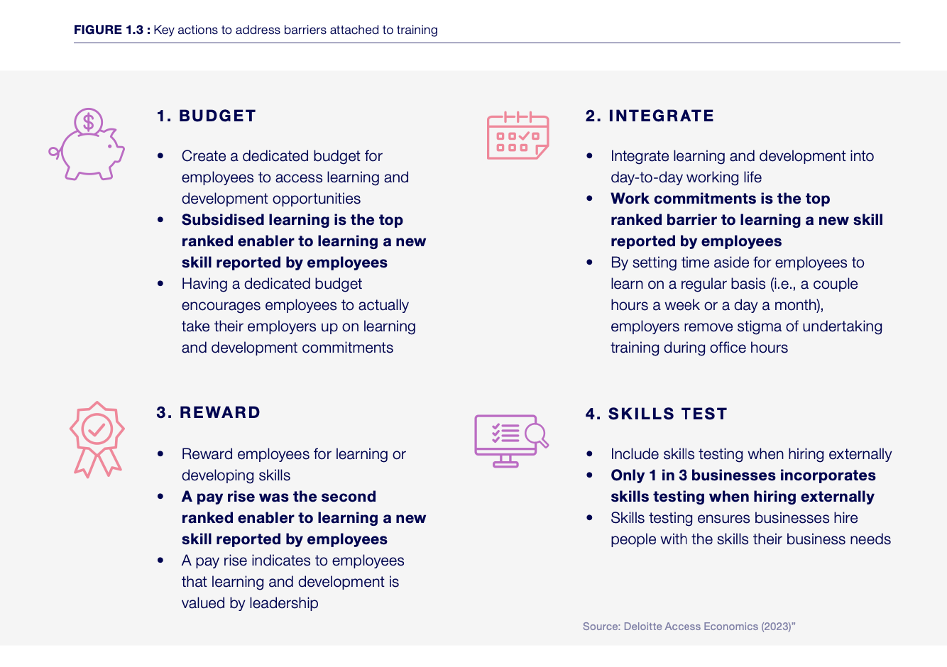While the benefits of training are well-recognised, getting training right isn’t always easy. Training can be ineffective, costly and it can be difficult to find the time to dedicate to learning and development. Some of the key barriers to learning new skills reported by surveyed employees include work commitments (18%), the cost of training courses (12%) and lack of employer resources or support (9%). To help tackle these barriers, there are various actions employers can take to help get the most out of training. This includes establishing a dedicated learning and development budget, creating space for employees to undertake training by establishing time for regular learning at work, rewarding employees for undertaking training, and by testing job candidates’ skills before hiring (Figure 1.3).