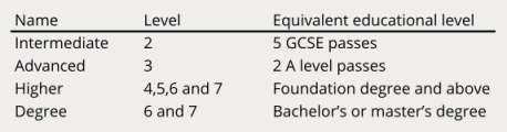 Apprenticeships can be studied at different qualification levels, which each have an equivalent educational level: