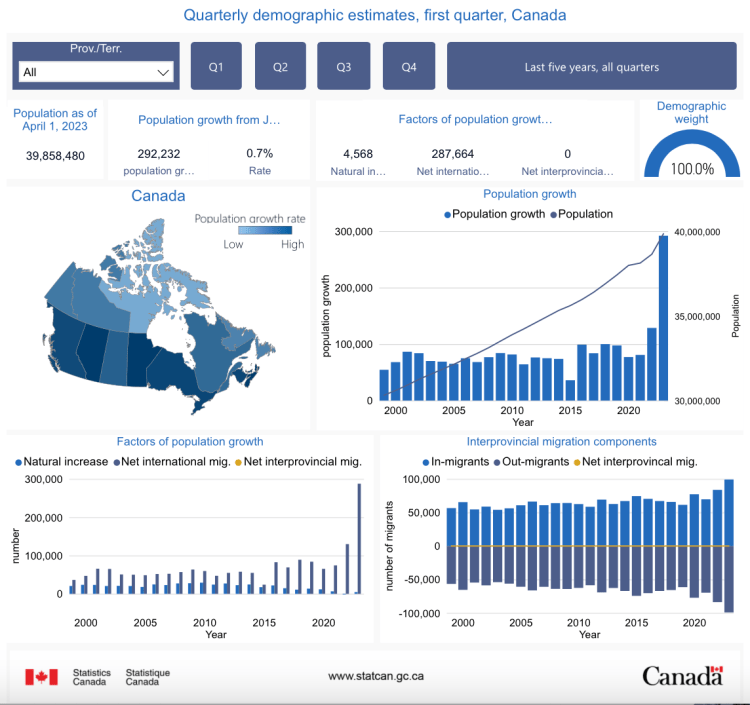 Canada’s population was estimated at 39,858,480 on April 1, 2023, an increase of 292,232 people (+0.7%) from January 1, 2023. This was the highest rate of growth in a first quarter for which comparable data are available (since 1972) and is a continuation of the higher growth rates observed over the previous four quarters.