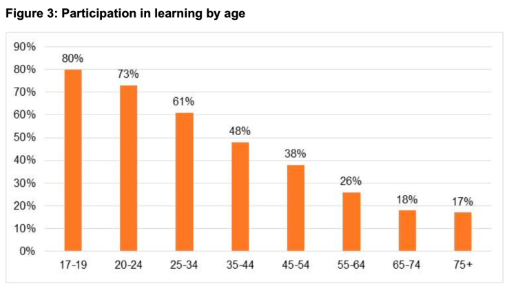Increasing participation in learning requires understanding why people do and don’t take part in learning. Research shows that people have a range of motivations to learn, particularly interest in the subject (37%); developing as a person (36%); and to improve job skills (25%). The most common reasons for not taking part in learning were: I don’t want to (29%); cost (29%); feeling too old (28%); and time pressures (16%).