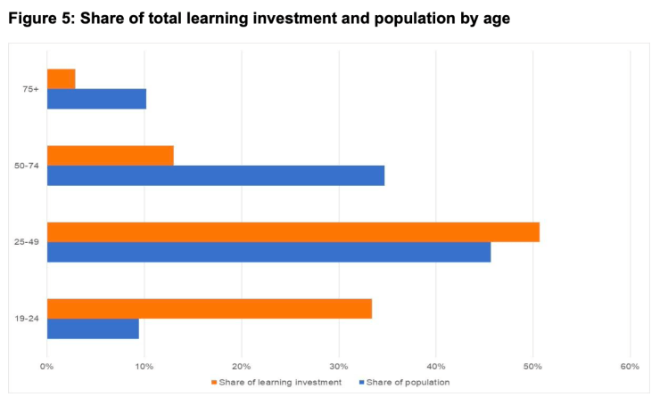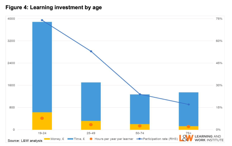 Based on analysis of Learning and Work Institute’s long-running Adult Participation in Learning Survey, the research finds that younger people are three times more likely to participate in learning than older people and also invest three times as much per year (£3,900 v £1,300). This lower investment by older people is a problem given longer working lives and economic change require people to update their skills more often through life. The same is true of investment by region and country. People in London (£1,400) invest more than double per person compared to the South East (£565) and Scotland (£624).