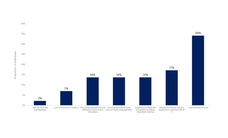 - Inequitably distributed: Training is more likely to be offered to employees with higher levels of education; in professional, scientific, and technology-focused roles; in their prime working ages (i.e., aged 25 to 54 years versus 16 to 24 or 55 to 64 years); and in full-time, permanent positions (versus part-time and/or precarious positions).