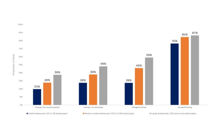 - ROI and workplace-focused: Given their concern for return on investment (ROI), firms tend to invest in training for immediate needs—such as onboarding and orientation, technology adoption, addressing skills gaps, and implementing innovations—and favour on-the-job and at-workplace modes of delivery over classroom and other external options.