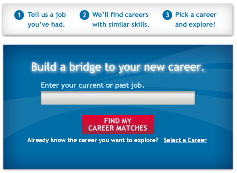“mySkills myFuture” helps you find careers with similar skills. You can pick a career to explore.