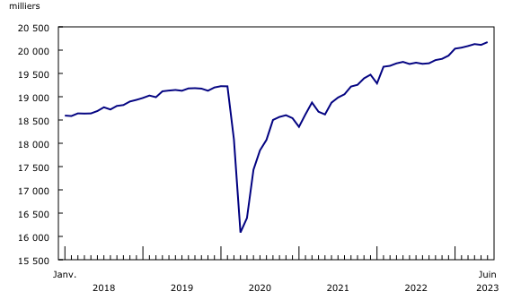 L’emploi a progressé de 60 000 (+0,3 %) en juin, surtout en raison des hausses observées dans le travail à temps plein (+110 000; +0,7 %).
