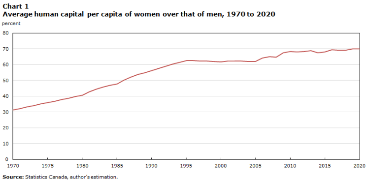 This paper provides a gender analysis of human capital and examines the contribution of women to the level and growth of human capital in Canada from 1970 to 2020. While the estimates cover 1970 to 2020, the 2020 estimates will be presented separately to examine the impact of the COVID-19 pandemic on human capital. Human capital is estimated using the income-based approach of Jorgenson and Fraumeni (1989, 1992), and it is calculated as the present discounted value of future labour income of individuals over their working life.