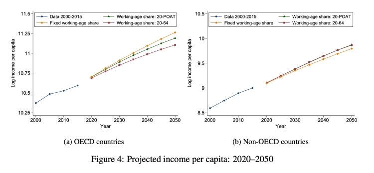 We conclude with four cautionary remarks. First, projecting the effects of population aging on economic growth involves considerable uncertainty. Among other things, it is difficult to reliably predict the occurrences of technological innovations, climate change, pandemics, and war and their impacts on per-capita income and its growth rate. Economic growth may well be slower than in the past (Gordon 2015). Therefore, we view our projections not as forecasts of economic growth but as estimates of the economic implications of global population aging trends based on available information and economic conditions today. Second, our results rely on the assumption that prospective measures of population aging reflect variation in age-specific functional capacities. While our evidence confirms that this is the case, we cannot rule out the possibility that alternative measures capture this variation more effectively. So far, potential alternatives such as function-based dependency ratios (Skirbekk et al. 2012, 2022) and healthy life expectancy (Vos et al. 2020) do not offer straight-forward approaches to modeling the economic gains associated with expansions of labor potential due to changing age patterns of health. How different measures of prospective aging and functional capacity compare with one another is a fruitful avenue for future research. Third, our analysis is silent with respect to the fiscal implications of population aging. A rising number of elderly people can pressure the adequate provision of pensions, healthcare, and long-term care (Rouzet et al. 2019), which might necessitate an increase in taxes that further slows economic growth. In theory, extending economic activity into older ages can absorb fiscal strain from social security systems and cushion this effect. Fourth, our analysis abstracts from distributional differences in economic activity around old-age thresholds. Because this abstraction accurately represents average functional capacity, it is inconsequential for projected growth of income per capita. Nevertheless, policies aimed at expanding economic activity into the older ages can have distributional and related welfare implications. Measuring this effect is a worthwhile area for future research.