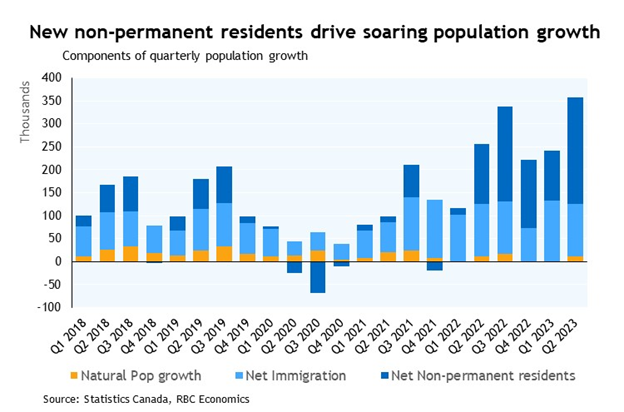 - The population rose +0.9% in Q2 from Q1, the strongest growth rate since the early 1970s. A surge in non-permanent residents (NPRs) accounted for nearly two-thirds of the growth, bringing annual growth in non-permanent residents (+46%) to at least a 50-year high.