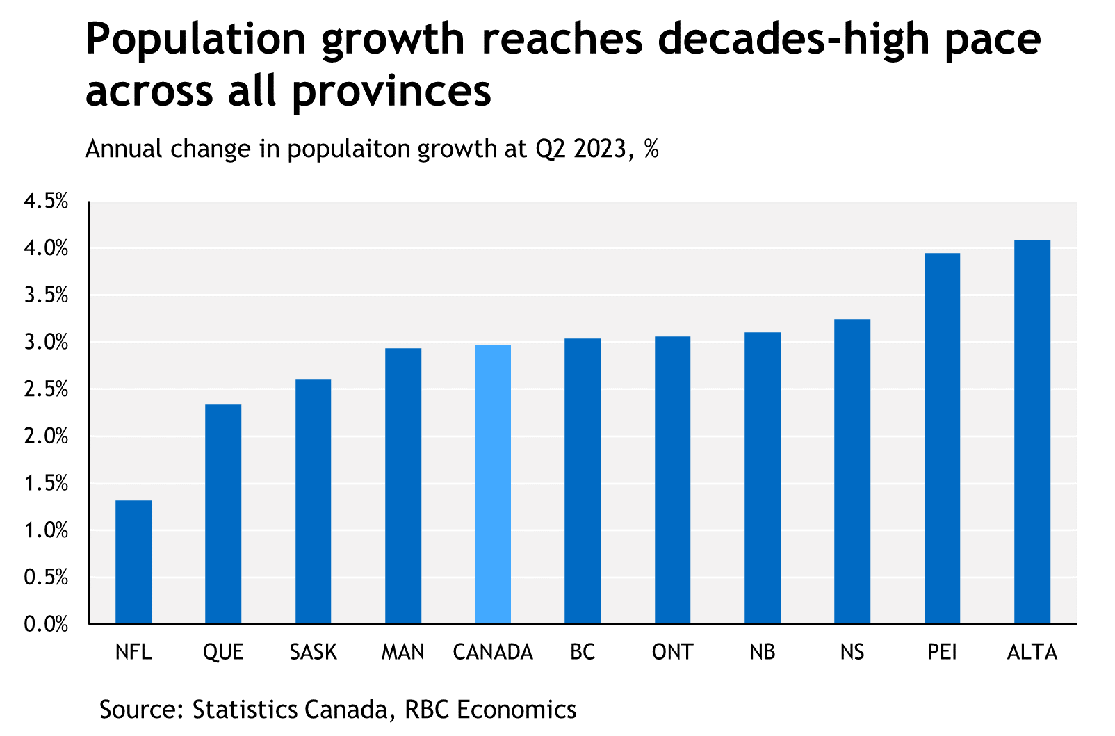 - A similar narrative can be told in Newfoundland & Labrador which posted the slowest population growth of all the provinces (+1.3%); yet registered the highest pace in more than 50 years.