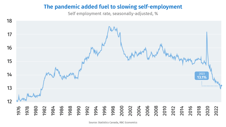 - The uncertainty of the pandemic, strong labour markets, and soaring inflation have sped up a decades-long decline in the self-employment rate.