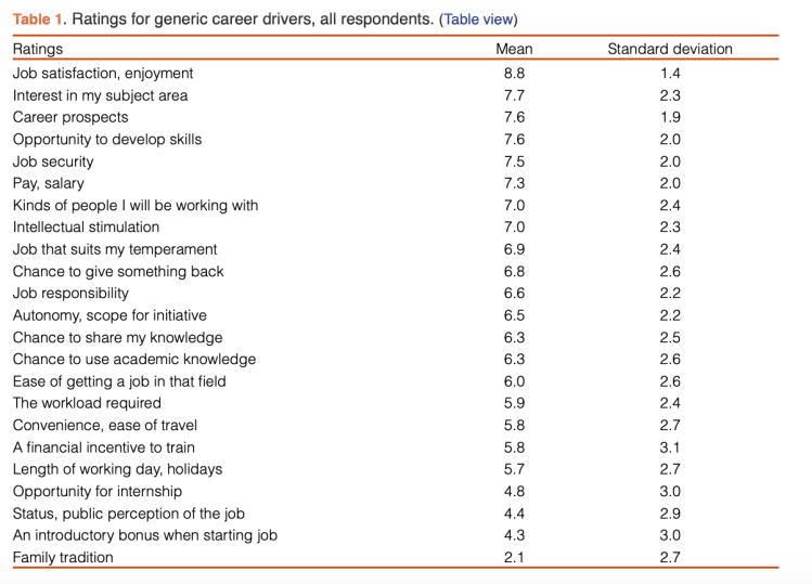 When considering their likely future career (with no focus on teaching yet), respondents were mostly concerned with job satisfaction/enjoyment (Table 1). Pay, job security, promotion prospects, an opportunity to develop new skills, and interest in their subject of study, were all also highly rated. Following a family tradition was the least important factor, along with the status of the job, getting an introductory bonus, and the chance for an internship.