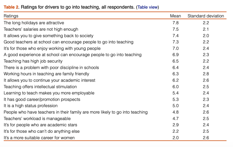 Thinking specifically about teaching as a possible career, the biggest reported attractors for all respondents was the long holidays, and the chance to give something back to society (Table 2). The biggest deterrent to a teaching career was that teacher salaries are not considered to be high enough. Respondents generally did not agree that teaching is a career for those unable to do anything else, or one especially suited for women (a factor that was included because it has been reported in other studies).