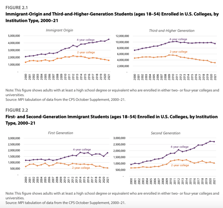 - Immigrant-origin students have been a vital source of growth for the U.S. college population for two decades, their numbers rising from 3.4 million in 2000 to almost 6.1 million in 2021. This 78 percent increase in enrollment came as total college enrollment rose 22 percent, from 15.3 million to 18.7 million. Immigrant-origin adults are over-represented on college campuses: although they made up 28 percent of U.S. adults ages 18 to 54 in 2021, they were 33 percent of college students.