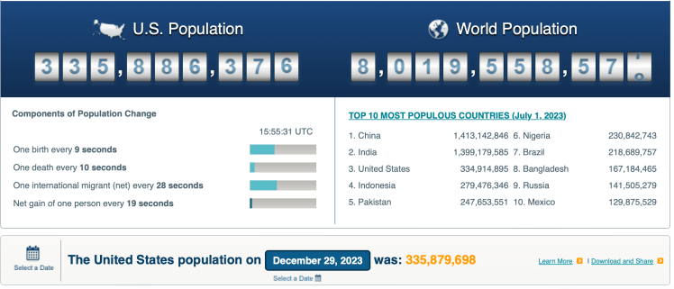 As we wrap up 2023, the projected world population on Jan. 1, 2024, is 8,019,876,189, an increase of 75,162,541 (0.95%) from New Year’s Day 2023. During January 2024, 4.3 births and 2.0 deaths are expected worldwide every second.