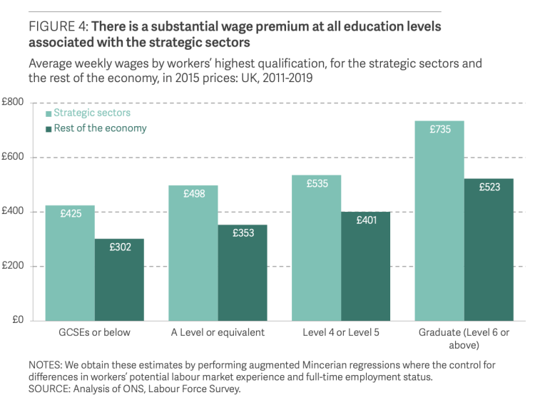 The strategic sectors are good places to work for everyone. It is striking – and very welcome – that wages are higher, and wage-experience trajectories steeper, for workers at every level of educational qualification in these strategic sectors than in the rest of the economy.