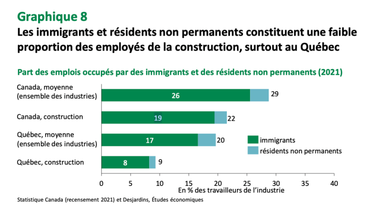 L’un des facteurs qui n’aident pas à atténuer la pénurie de main‐d’œuvre est la faible intégration des immigrants dans le secteur. La construction fait partie des trois secteurs (parmi 20) comportant la plus faible proportion d’immigrants et de résidents non permanents au Québec (9 % parmi la main‐d’œuvre du secteur en 2021), juste devant l’extraction minière, de pétrole et de gaz ainsi que l’agriculture, la foresterie, la pêche et la chasse, qui occupent les derniers rangs à 7 % et 8 %, respectivement. La moyenne est de 20 % pour l’ensemble des industries au Québec (graphique 8).