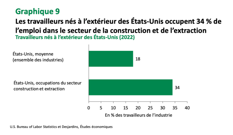 En bref, l’industrie de la construction ne bénéficie pas autant que d’autres de l’immigration, malgré la pénurie de main‐d’œuvre du secteur. Cette situation contraste avec celle des États‐Unis (graphique 9). Les travailleurs nés à l’extérieur des États‐Unis représentaient 34 % des emplois dans le secteur de la construction et de l’extraction, contre 18 % en moyenne pour l’ensemble des secteurs en 2022.