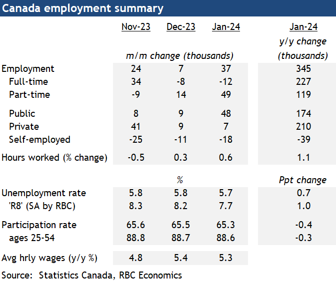 The Canadian labour market data is notoriously volatile, but details underlying the January upside employment growth (and downside unemployment rate) surprise were also firm. The increase in hours worked is consistent with GDP ticking higher early in 2024, and adds to early signs that housing markets have perked up. Growth in the economy still looks softer accounting for surging population growth. Canadian GDP is on track to post a 7th consecutive per-capita decline in Q1/2024. But stronger than feared economic data both in Canada and abroad are leaving central banks with flexibility to be patient before starting to ease off the monetary policy brakes. The data today will reinforce that near-term interest rate cuts from the Bank of Canada are unlikely. Our own base case assumes the first interest rate cut from the BoC in June.