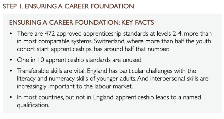 Three factors obstruct the realisation of this vision for apprenticeship. First, not enough apprenticeships provide the breadth of education and training needed to provide a suitable career foundation for young people. Second, it is often unclear what apprentices can expect – not least because they often do not receive the minimum level of training required for their course – and there are high levels of dropout. Third, youth apprenticeship is a relatively small and declining part of the apprenticeship system. These are large obstacles, but they can be overcome. In response to these challenges, this report draws on international experience to propose three steps that, if taken together, would help establish a world class apprenticeship system.