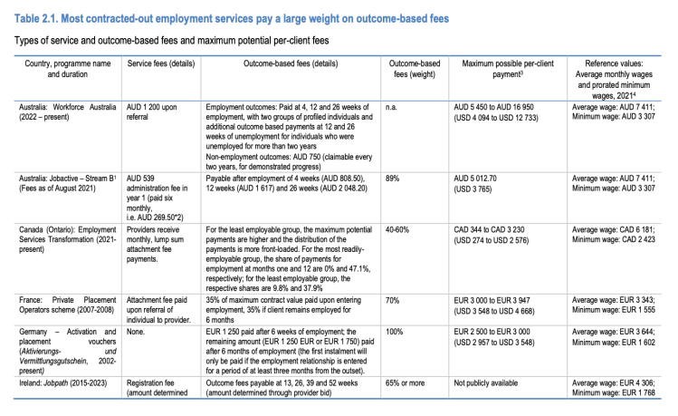 Two out of five OECD countries contract out some of the job brokerage and counselling functions of publicly financed employment services using outcome-based payment models. This paper examines several important aspects related to the design and implementation of such outsourcing. First, innovative payment models can improve incentives for external providers to offer training and more effective services for hard-to-place clients. Second, providing forward guidance to providers and accounting for contingencies can mitigate their risks, e.g. of being underpaid relative to expenses incurred, thus lowering service costs. Third, letting individuals choose a provider can result in services that are better tailored and foster ongoing competition between providers. Finally, automating data exchange can, somewhat paradoxically, improve data privacy and data protection while enabling new payment models.