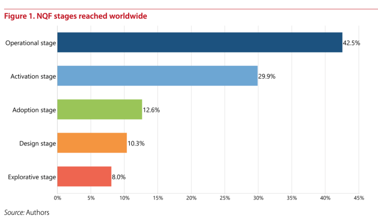 The majority of the NQFs surveyed, 65 of the 93, are now at one of the two more advanced stages, namely activation and operational. 30% are at the activation stage, signifying that stable governance structures and day- to-day administrative capacities are in place; QA arrangements have been developed; and some outcomes-based qualifications are being allocated to levels and are available for use via registers. During this stage, we see the gradual but distinct shift from an internal focus on the design and adoption of the framework, to an external focus where end users such as learners, providers, workers, and employers are addressed. 43% have reached the operational stage. By operational, we mean that they have adopted the NQF; they include outcomes-based qualifications; their governance arrangements are settled and functioning; they place qualifications in a register or database; and the certificates and diplomas bear NQF levels. Here, the NQF is fulfilling one of its key intended functions, improving transparency and comparability.