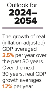 In CBO’s projections, real (inflation-adjusted) GDP grows at an average rate of 1.7 percent per year from 2024 to 2054, slightly slower than the growth of real potential GDP—the maximum sustainable output of the economy—over that period. Real potential GDP is projected to increase at an average rate of 1.8 percent per year over the next 30 years, slower than such growth over the past 30 years, when it averaged 2.4 percent. That decline is attributable to slowing growth in the poten- tial labor force (an estimate of what the size of the labor force would be if economic output and other key variables were at their maximum sustainable amounts) and in potential labor force productivity (the ratio of real potential GDP to the potential labor force) over the 2024–2054 period.