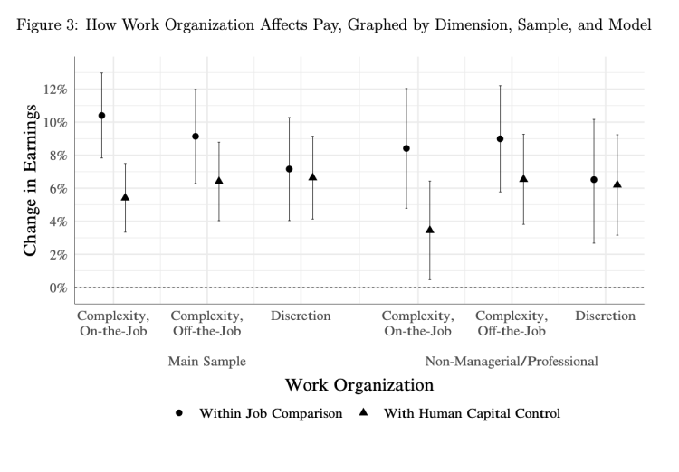 Indeed, finally, for practitioners, we identify broad paths through which work organization can support higher-paying frontline jobs. While few employers seek to increase labor costs while holding all else equal, many are newly focused on retention and recruitment of frontline workers. Insofar as a tight labor market forces employers to raise pay for these workers, then determining how to adjust work organization to boost productivity and support these wages becomes crucial. While our results are not an artifact of labor market tightening—we adjust for time-varying and occupation-specific local labor market dynamics—we place our results in the broad context of rising pay at the bottom of the pay scale during the period we study. Employers that shift toward more complex or higher-discretion frontline work organization are able to increase pay.