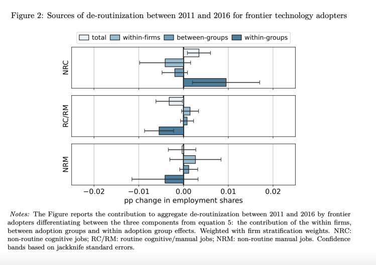 Based on a decomposition approach, the authors are able to show how the inequality between firms within the group of frontier adopters explains their contribution to overall de-routinization. The key insight: the adoption of frontier technology does not lead to a widespread replacement of routine jobs within firms. Rather, only a subset of larger firms is responsible for the de-routinization among frontier adopters.