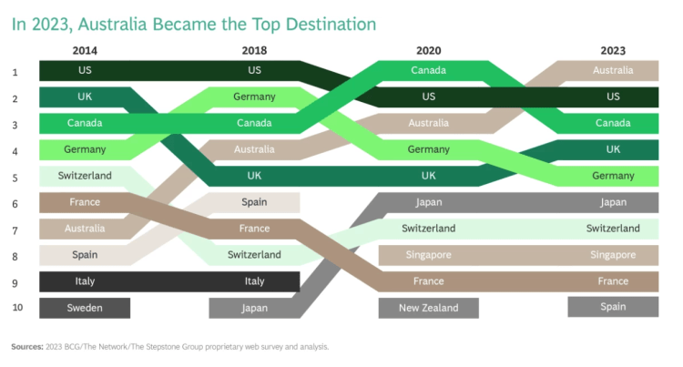 In 2023, Australia, which has been steadily rising through the ranks since we initiated this series, finally topped the list of desirable country destinations.