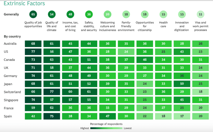 We looked at extrinsic factors—characteristics of countries. We found that one consistent, primary consideration supersedes individual country brands: the quality of job opportunities. Nevertheless, a few countries benefited from another prominent consideration: quality of life.
