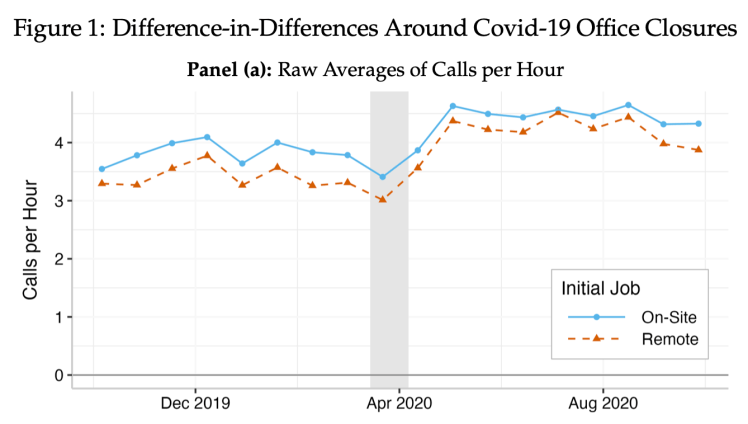 We analyze remote work’s impacts in the American call-centers of a Fortune 500 firm, which hired both remote workers (N=344) and on-site workers (N=1,592) before Covid-19. Pre-pandemic, managers expressed reservations about remote workers’ productivity. This intuition was borne out in the data: remote workers answered 12 percent fewer calls per hour than on-site workers, despite handling calls randomly routed from the same queue.