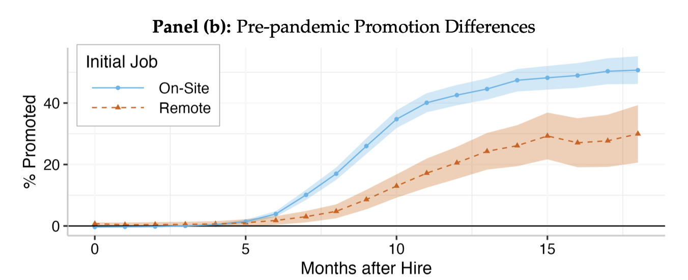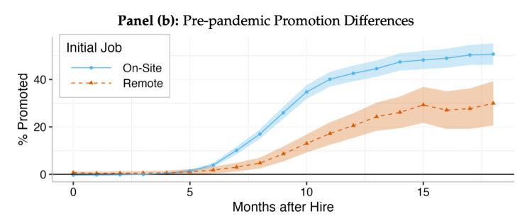 We find that remote work negatively impacts workers’ career trajectories. Remote work reduces the frequency of one-on-one meetings with managers and training sessions devoted to developing workers’ skills. These negative effects may have contributed to remote workers’ lower promotion rates pre-pandemic. Before the offices closed, remote workers were promoted at less than half the rate of their on- site peers; once the offices closed, this difference in promotion rates disappeared.